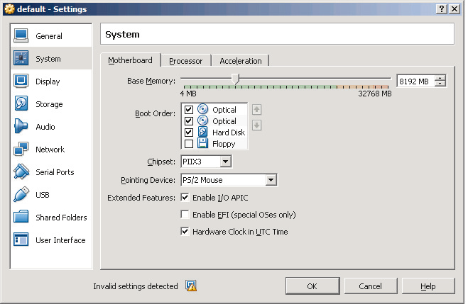 VirtualBox default VM settings